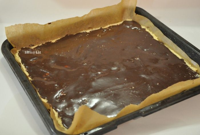Фундук и 50 гр шоколада порубить. Оставшееся сырое тесто смешать с нарубленным фундуком и шоколадом и посыпать сверху на растопленную шоколадную массу.