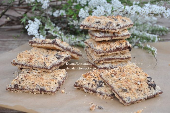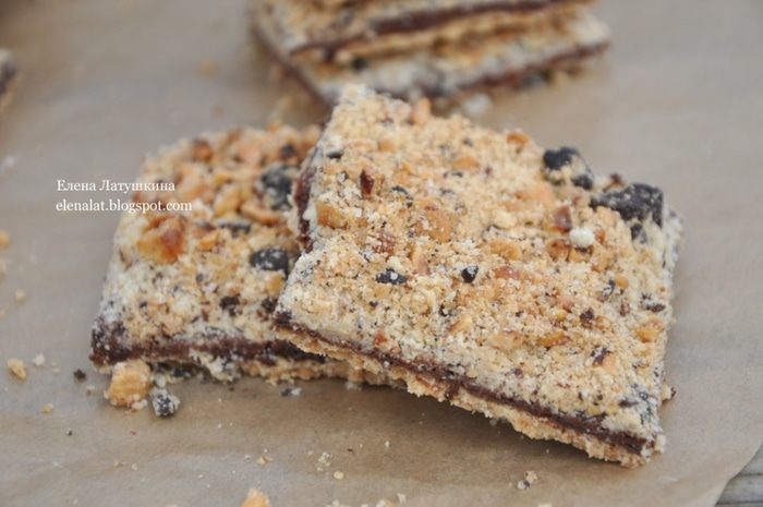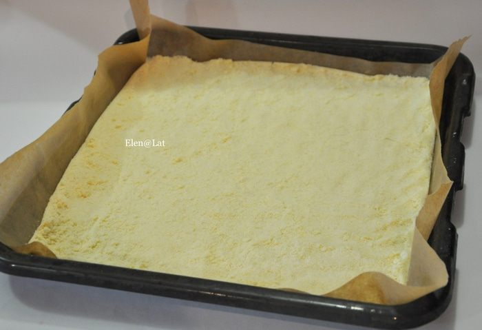 Выпекать 20-25 минут при 180С. Готовый пласт снять с противня вместе с пергаментом. Остудить и нарезать на квадраты.