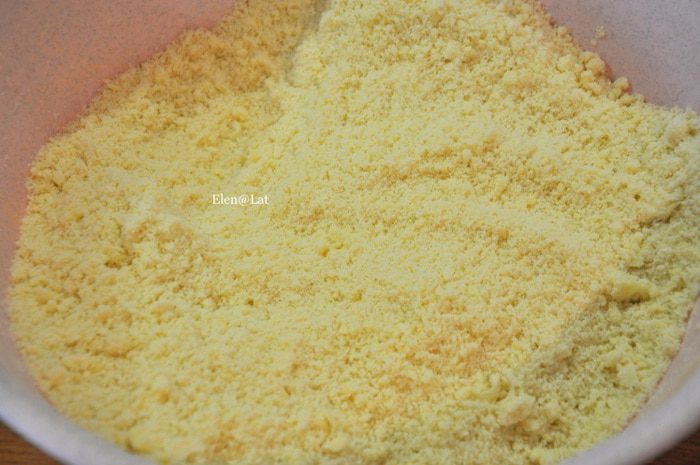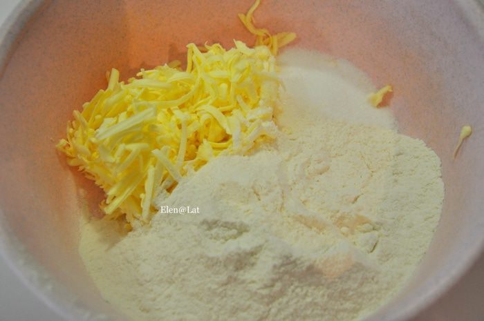 Готовим тесто. Тесто песочное. Трем на терке сливочное масло, смешиваем с сахаром и мукой.