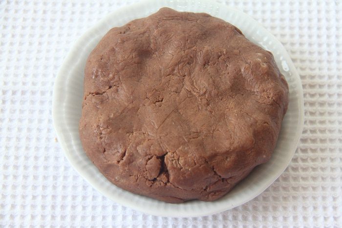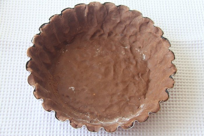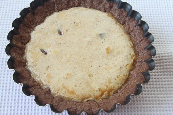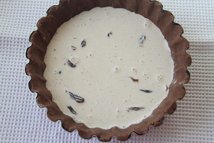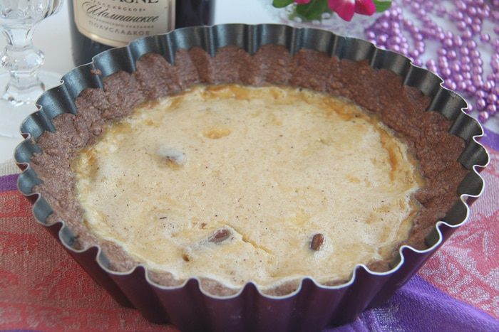 Выложить пласт теста в форму для выпечки, поставить в морозилку на 20-30 минут. За 15 минут до выпечки включить духовку на 180°С.