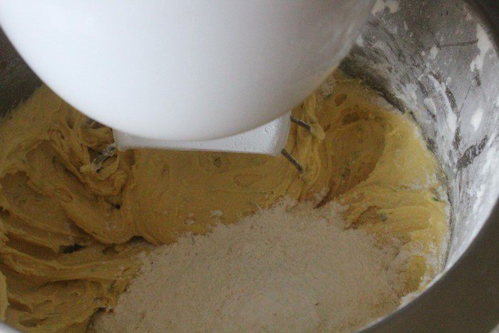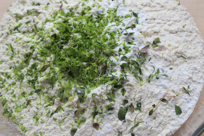 Смешать сухие ингредиенты - муку, разрыхлитель, листики тимьяна и цедру лайма.