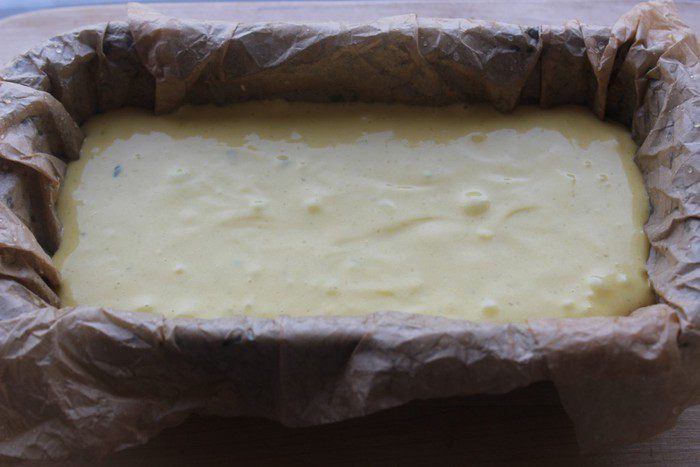 Выложить тесто в прямоугольную форму, выстеленную пекарской бумагой.