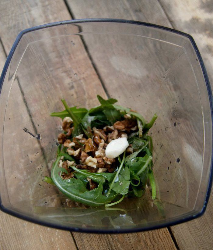 Для песто: руколу промыть, обсушить, сложить в чашу блендера. Добавить грецкие орехи (предварительно обжарив на сухой сковороде), зубчик чеснока, соль и перец по вкусу.
