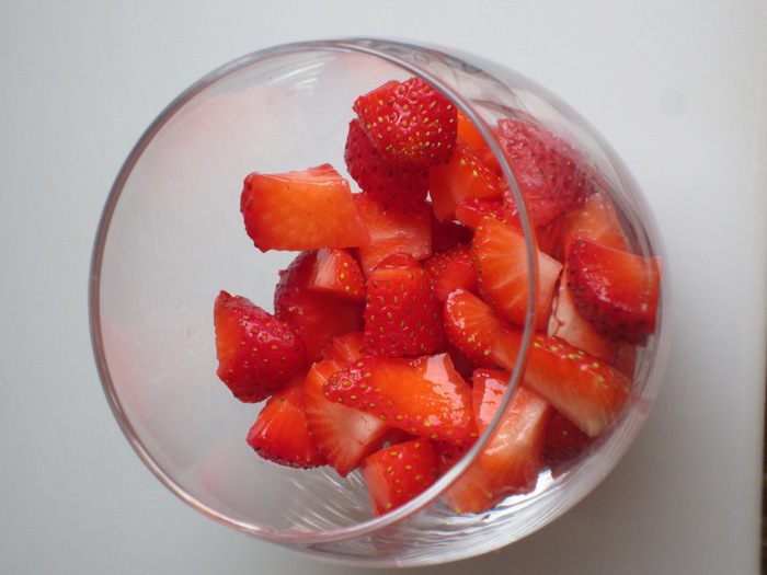 Клубнику мелко нарезать и разложить по бокалам.