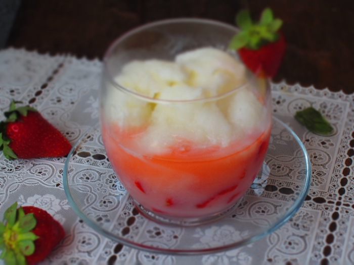 Сверху выложить сорбе.Приятного аппетита:))