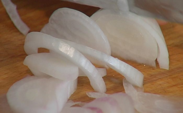 Лук почистить и нарезать тонкими полукольцами.