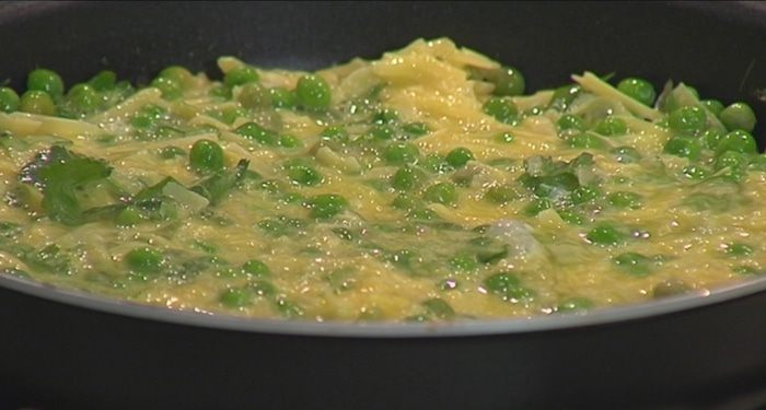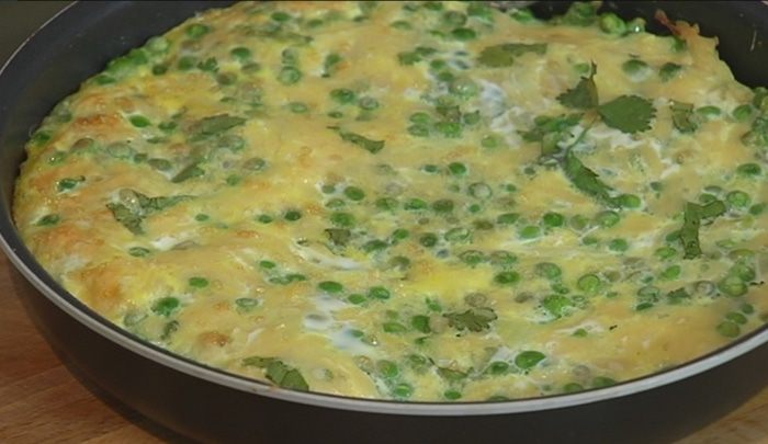 Яйца перемешать с зеленым горошком, натертым сыром и кинзой, а затем выложить в сковороду на картофель.