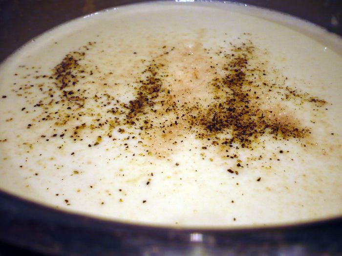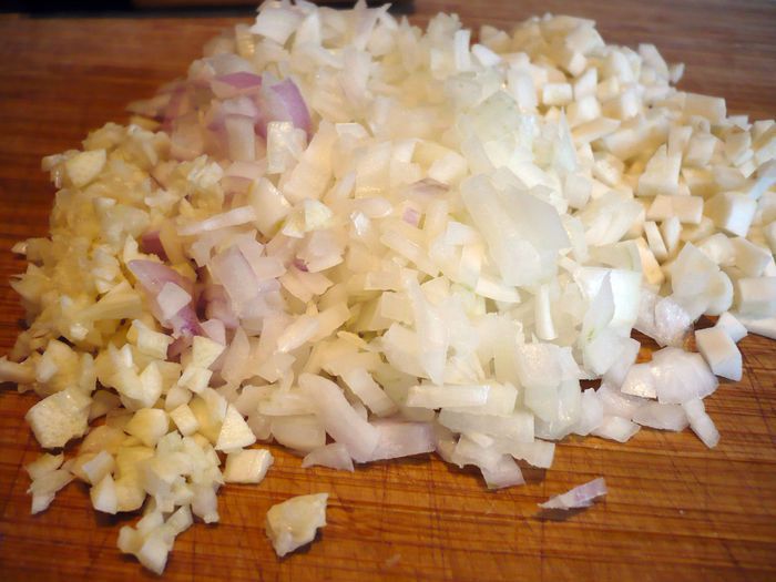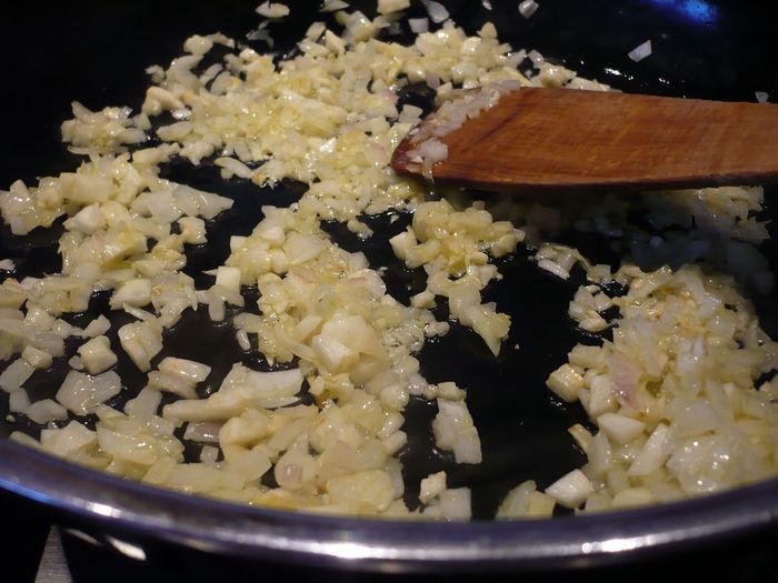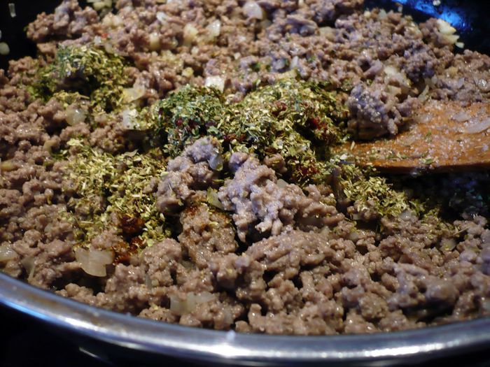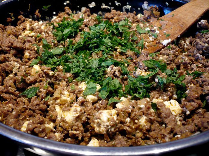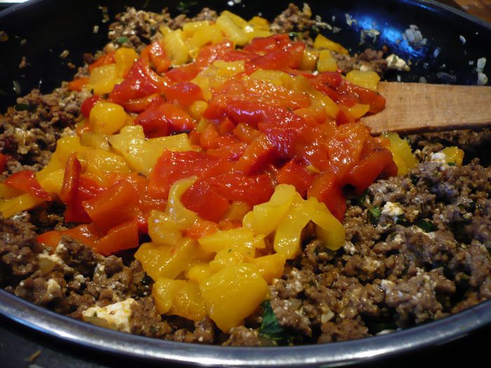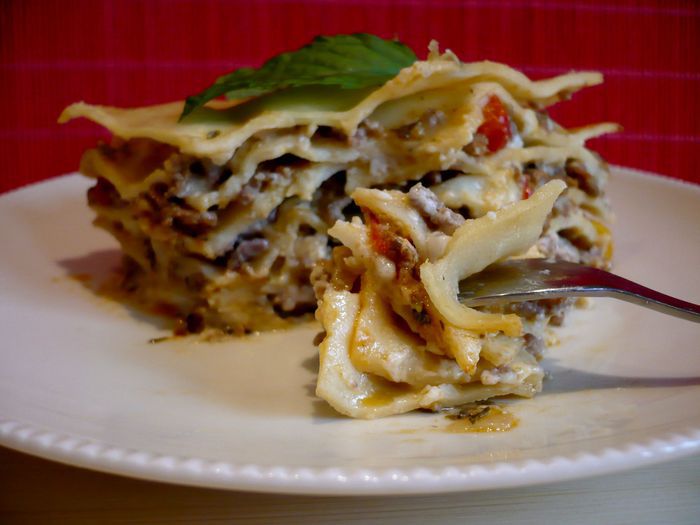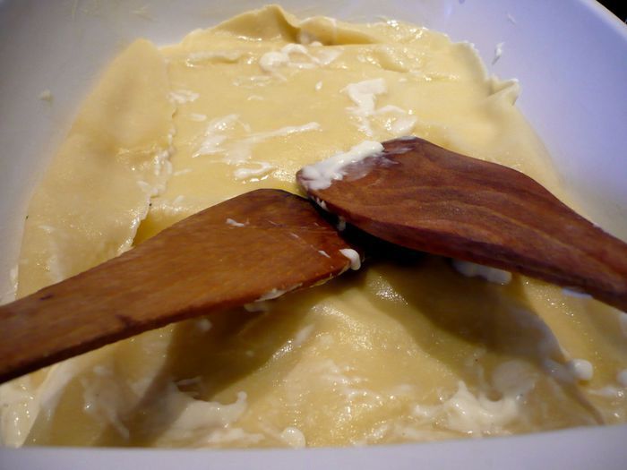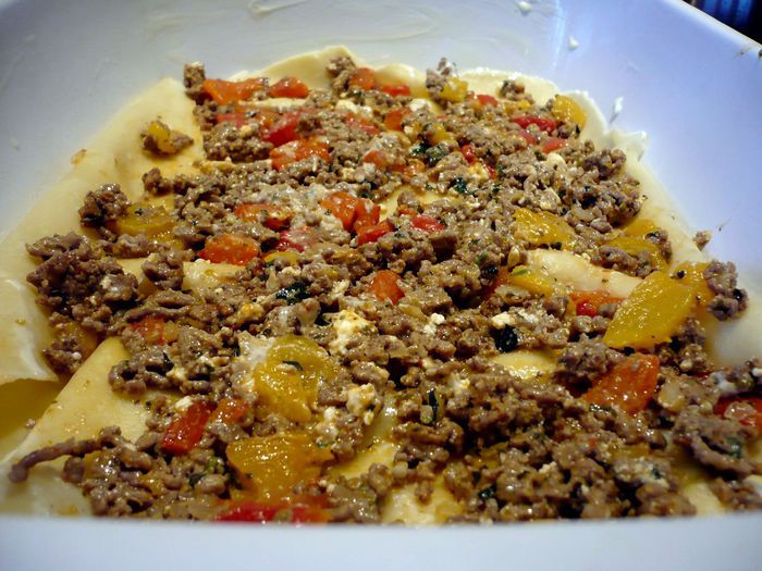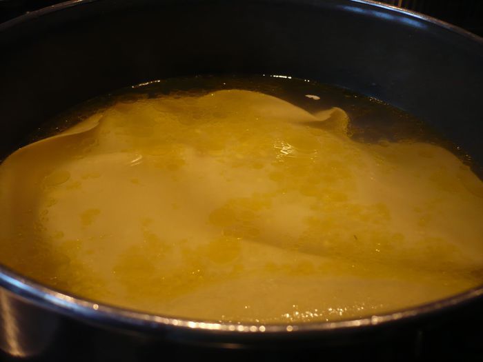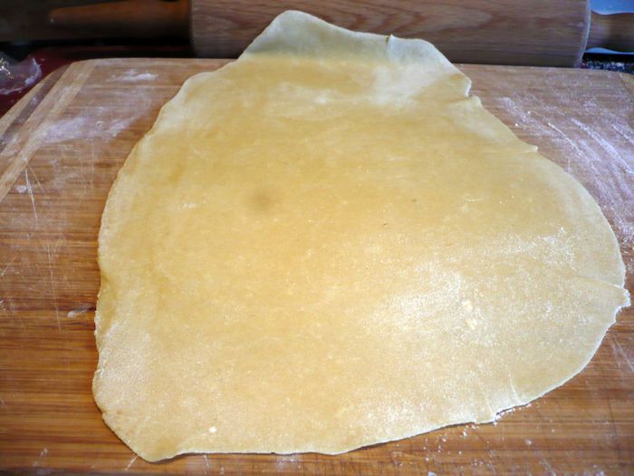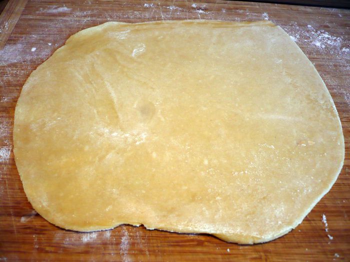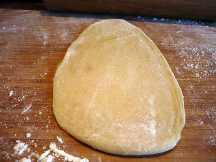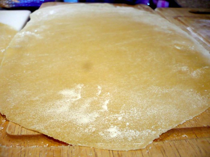 Сначала приготовим тесто. Для этого в емкости, в которой будем замешивать тесто, смешаем яйца (у меня крупные) и 1,5 ст.л. оливкового масла. Посолим, потихоньку, примерно по 80 г, начнем подсыпать муку, каждый раз хорошо перемешивая тесто. Может быть, вам понадобится чуть меньше муки. Выкладываем тесто на рабочую поверхность и доводим его до эластичного состояния. Если вы пересыпали муки, то добавьте при работе с тестом на рабочей поверхности немного воды (достаточно просто смочить руки) и оливкового масла (на ¼ часть теста — не более половины ч.л. масла). На фото видно, что часть теста справа раскатана достаточно хорошо, а слева — еще нуждается в вымешивании. Я поделила тесто на четыре части, так мне было проще с ним работать. Заворачиваем эластичное тесто в пищевую пленку и ставим минут на 15 в теплое место (у меня это духовка, нагретая до 50 градусов). Затем оставляем тесто отдохнуть минут 10 в прохладном месте.
