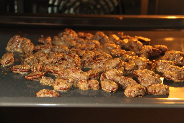 Пекан выложить на противень и подсушить в духовке при 150*С 15 минут.