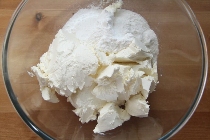 Ингредиенты для сырной части пирога должны быть комнатной температуры. Я использовала аналог сыра "Филадельфия" российского производства - сыр "Виолетт", он достаточно плотный, поэтому в рецепте присутствуют сливки. Если ваш сыр не такой плотной консистенции, можно сливки не использовать.