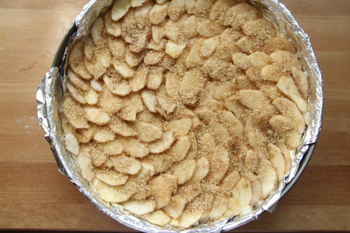 Выложить яблоки на сырную начинку. Выпекать при 160*С 60-65 минут. Дать чизкейку остыть.