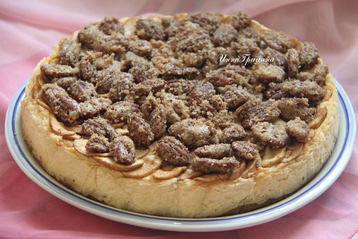 Освободить пирог из формы, переложить на блюдо. Выложить сахарный пекан на чизкейк. Приятного чаепития!