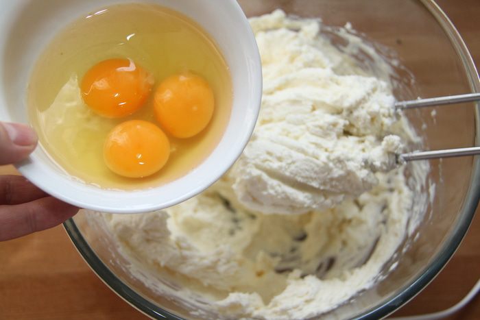 В сырную смесь по одному ввести яйца, полностью вымешивая после каждого добавления.