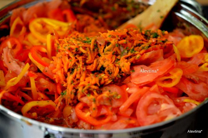 На терке натираем морковь, нарезаем помидоры, сладкий перец,кинзу и петрушку. Я использую кухонного помощника комбайн, который нарезает и шинкует овощи. Выкладываем партиями в емкость и посыпаем каждый раз отмеренной солью . Дать постоять 30-60 мин. Помешиваем.