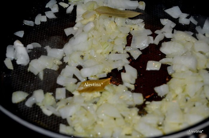 Обжарить на разогретой сковроде с маслом лук,чеснок и лавровый лист несколько минут.