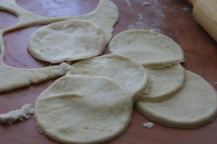 Тесто раскатать, вырезать кружочки.