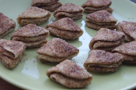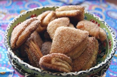 Каждый кружочек обмакнуть в сахар с одной стороны, свернуть пополам, обмакнуть еще раз, свернуть, обмакнуть. Должны получиться вот такие четвертинки. Выпекать при 180 гр. 20 минут.