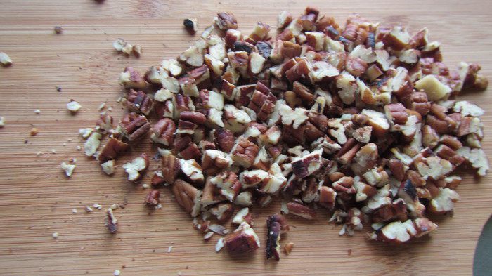 Разогреваем духовку до 200 гр. Сливочное масло растапливаем и остужаем. Орехи пекан обжариваем на сухой сковороде и рубим средне (те 20шт, что рассчитаны для украшения, можно оставить целиком или тоже порубить, по вкусу).