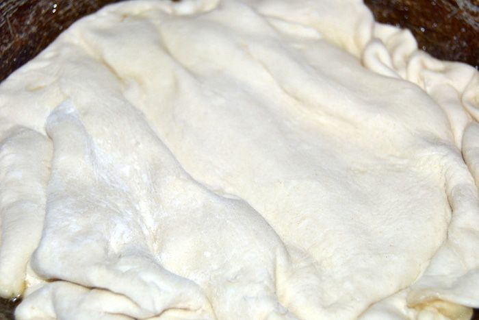 Тесто раскатать по размеру. Достать из духовки сковороду и накрыть баклажаны тестом, аккуратно подгибая края вниз.