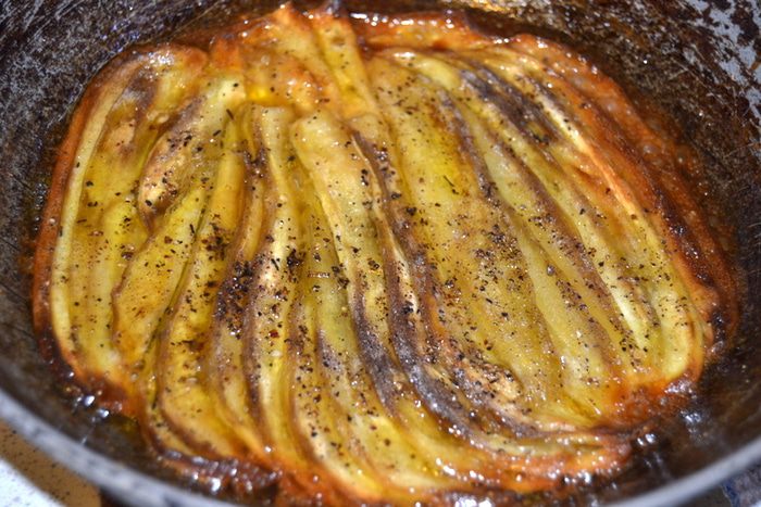 В сковороду выложить баклажан в один слой. Готовить баклажан на среднем огне до образования карамели. Примерно 20 минут.