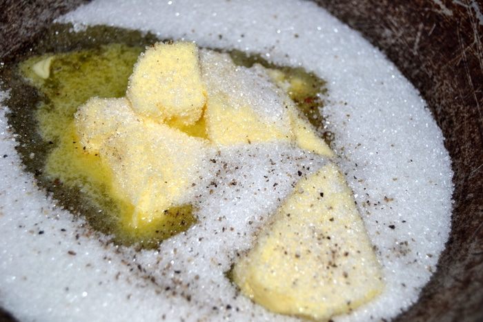 Сливочное масло положить в сковороду, в которой потом будете выпекать пирог. Насыпать сахар, соль и перец.