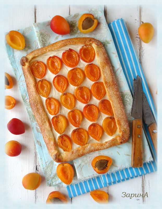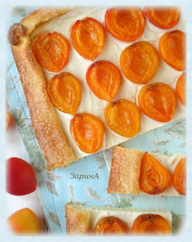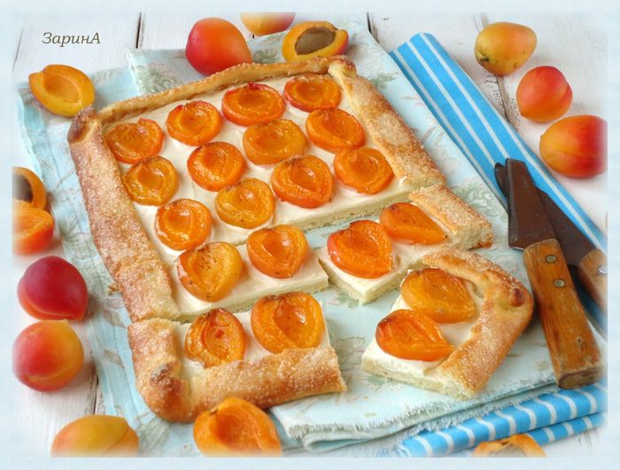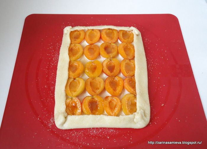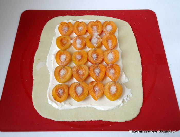 Не доходя до краев теста нанести смесь из крем - чиза и плавленого сыра, сверху выложить половинки абрикоса, присыпать его сахаром.