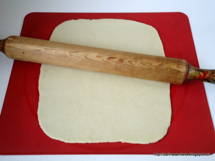 Каждую часть теста раскатать в пласт, лучше всего тесто раскатывать на силиконовом коврике прикрыв сверху пленкой.