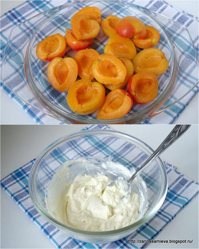 Абрикосы вымыть и отделить от косточек. Крем – чиз, плавленый сыр и 2 ст. л. сахара смешать в миске.