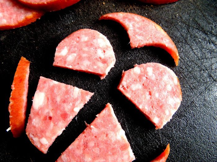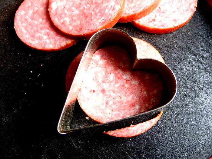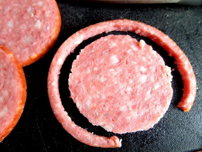 Для хвостика отрезаем краешек кружка колбасы.