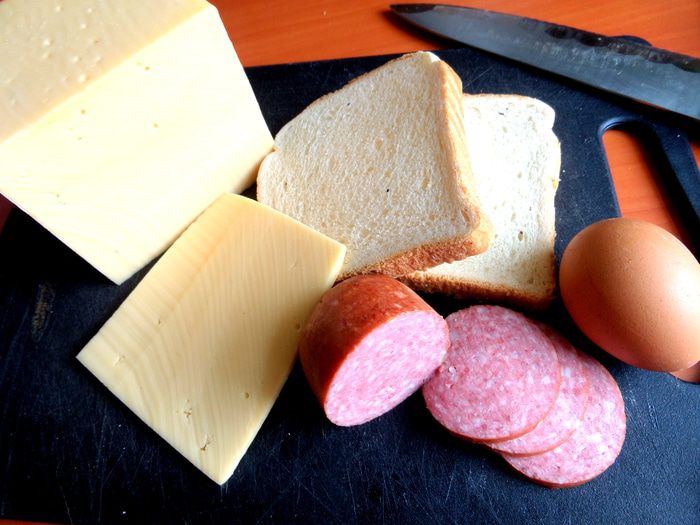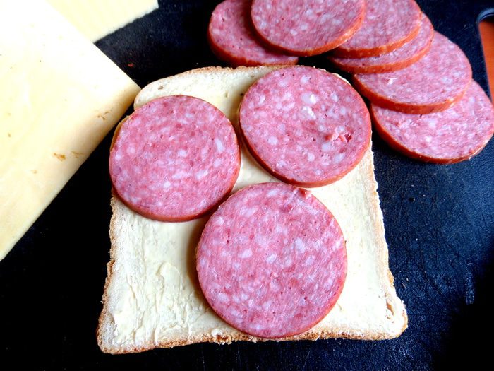 Промазываем маслом хлеб и кладём сверху колбаску. Накрываем квадратиком из сыра.