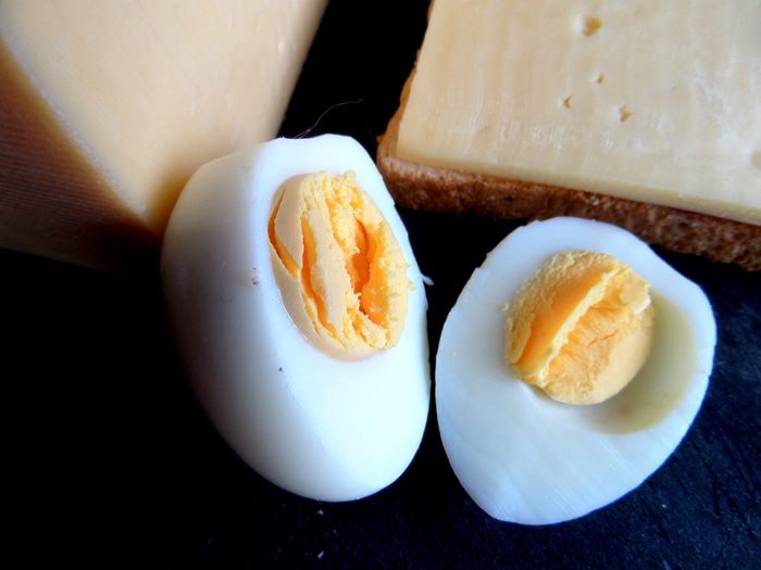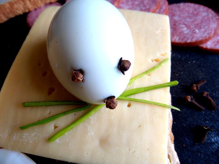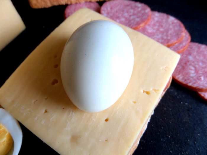 Яйцо отвариваем заранее и отрезаем край для устойчивости на сыре.