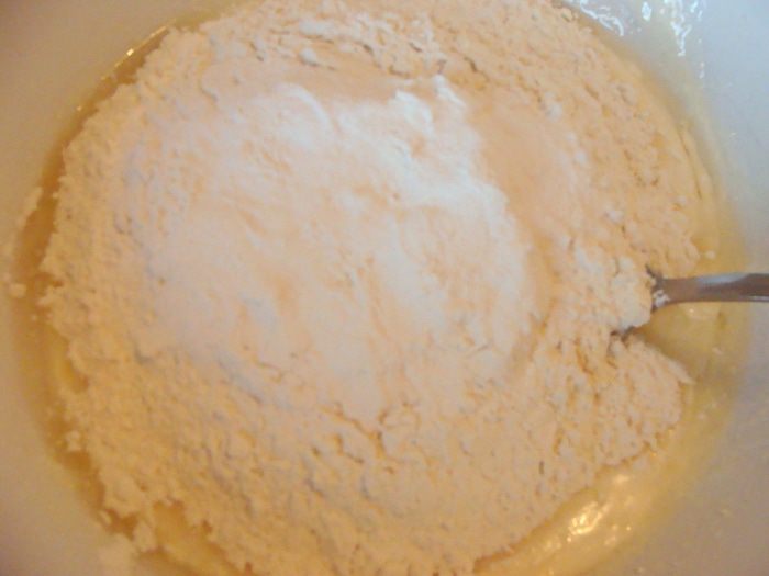 Всыпать в массу просеянную муку и разрыхлитель.
