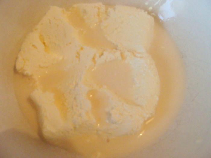 Творог растереть с молоком сахаром.