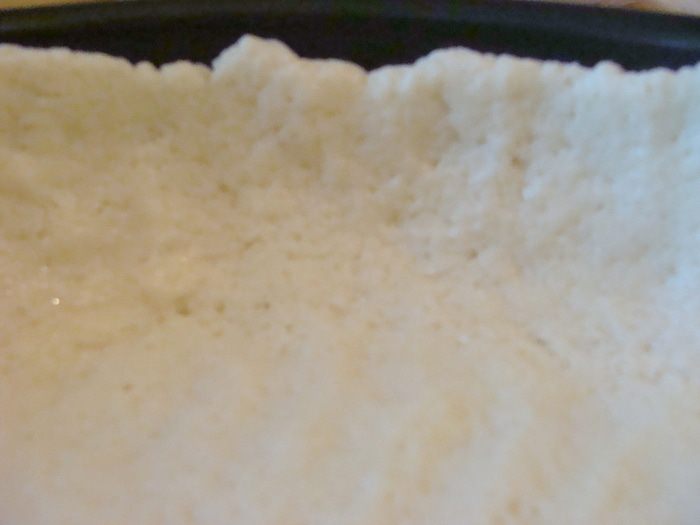 Форму я использую разъемную, диаметром 26 см. Смазывать ее не нужно. Тесто размять в руках, сформировать лепешку, положить в форму и придавливая, пальцами, распределить тесто равномерно, постепенно поднимая края вверх.