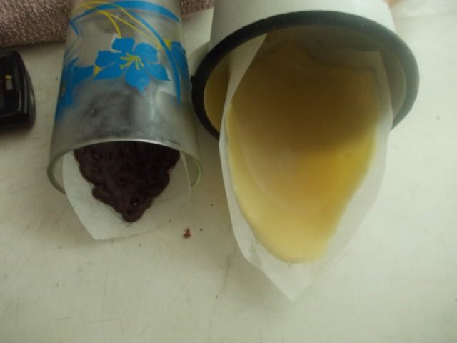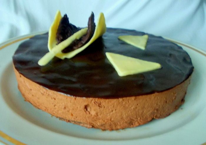 На пергаменте нарисуйте ровные квадраты,карандашом и смажьте чуточку растительным маслом.Для белой фигурки побольше,для черной поменьше. Затем выдавите шоколад белый,сплошным рисунком.а черный рельефными завитушками. Положите их в стаканы разного размера и отправьте в морозилку для застывания.Также сделайте из белого шоколада пару треугольничков и полосочек.