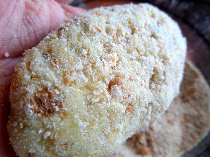 В панировочные сухари кладём котлетку из пюре.