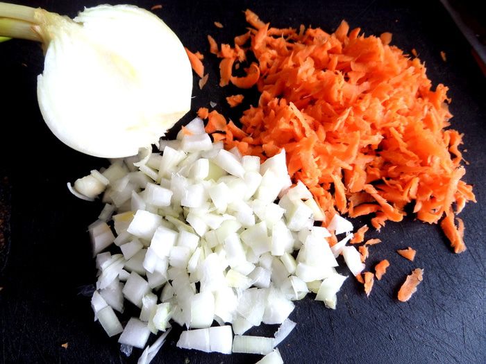 Готовим поджарку: лук нарезать, морковь крупно натереть.