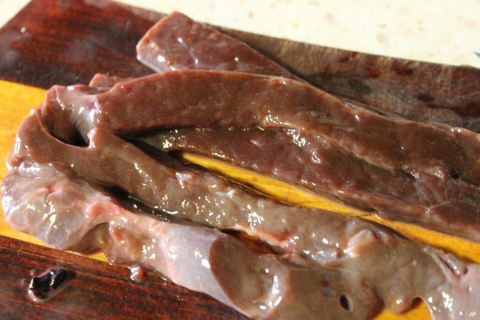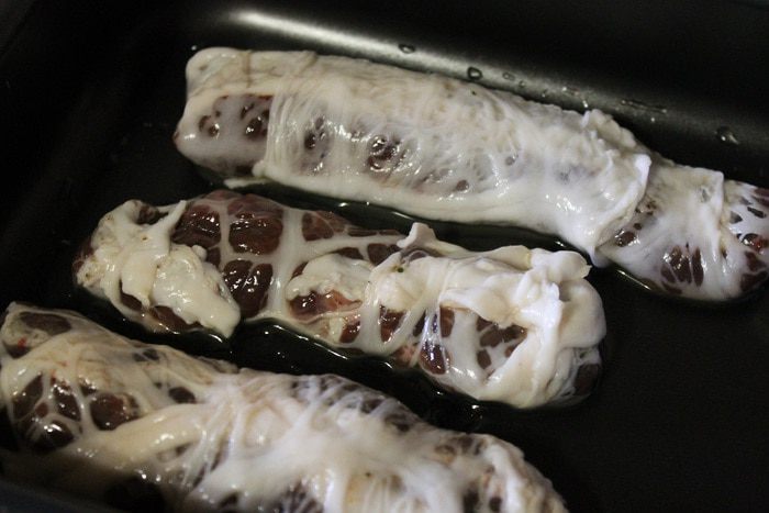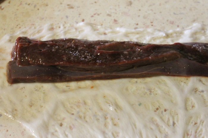 Берем жировую сетку, ее понадобится 30 г. Разрезаем ее на 3 части. Разравниваем каждую часть на рабочем столе и кладем ближе к длинному краю три брусочка печени. Солим, перчим по вкусу.