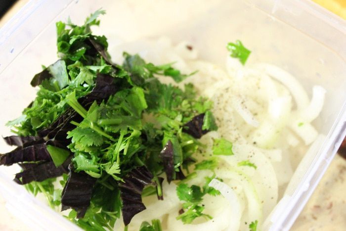 Лук нарезать полукольцами, сложить в миску, добавить уксус и перемешать. Затем вымыть и мелко нарезать всю зелень, добавить к луку и опять перемешать.