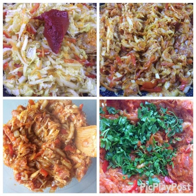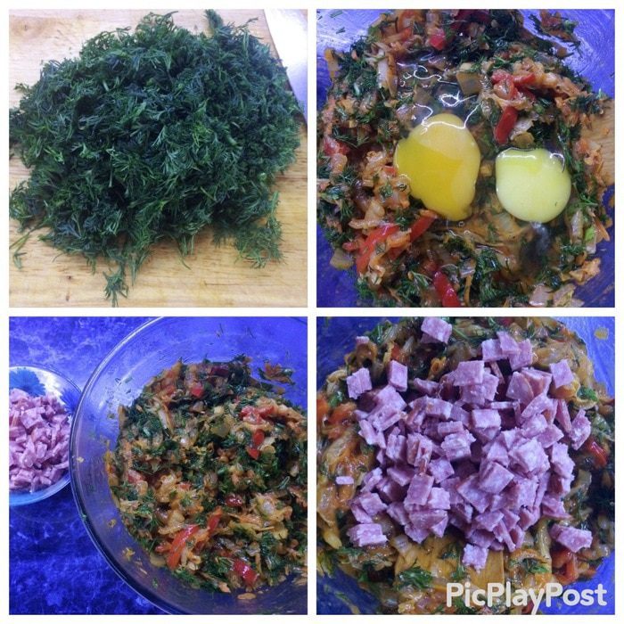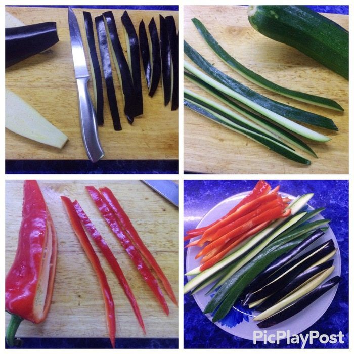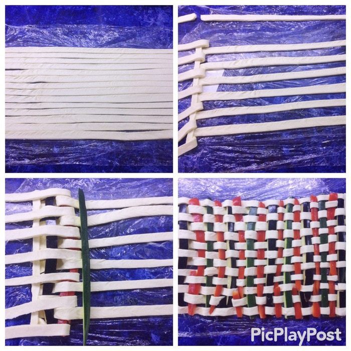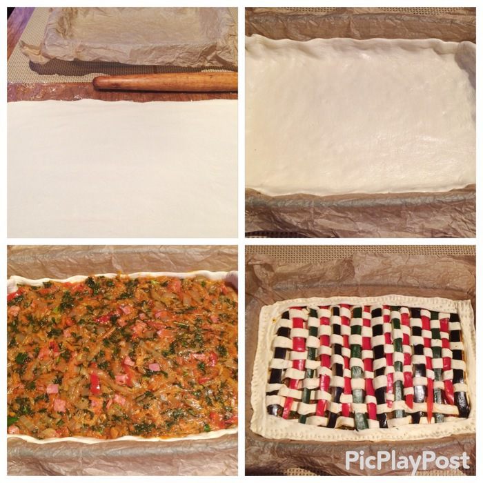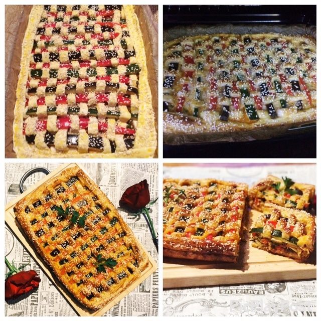 Одну полоску наклеить перпендикулярно нарезанному тесту (как на фото) и через одну полоску откинуть их в сторону. Положить одну полоску баклажана кожурой вверх, перекинуть полоски обратно. Затем перекинуть полоски, начиная уже со второго ряда, т.е. в шахматном порядке. Теперь уложить полоску красного перца и повторить перекидку полосок. Следующий овощ — это цукини, и опять перекидываем полоски. Затем опять добавляем перчик и опять плетением занимаемся. Я думаю, по фото процесс более понятный, нежели я пыталась описать словами. Идея в том, чтобы четко были видны цвета овощей. Т.е. т.к. перец красный, то мы его чередуем чаще. В итоге должно получится вот такое пестрое «одеяльце», это мы положим на начинку.