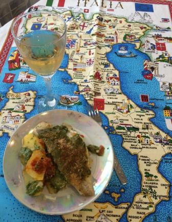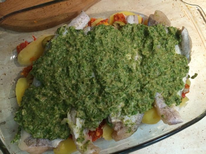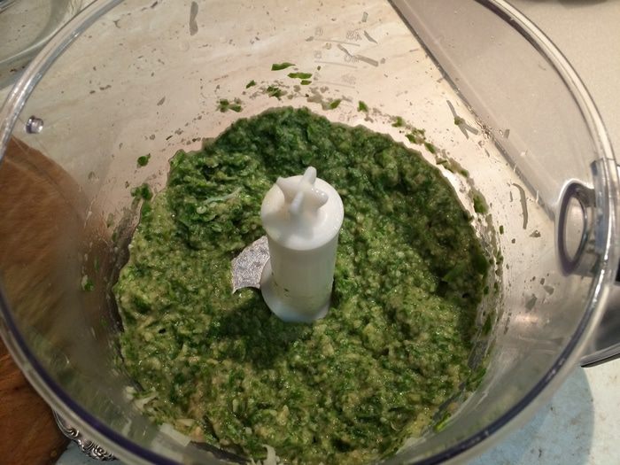 Взбить в блендере листья петрушки, шпината, отжатый хлеб, 2 зубчика чеснока, тертый пармезан, 2 ст.л. оливкового масла.