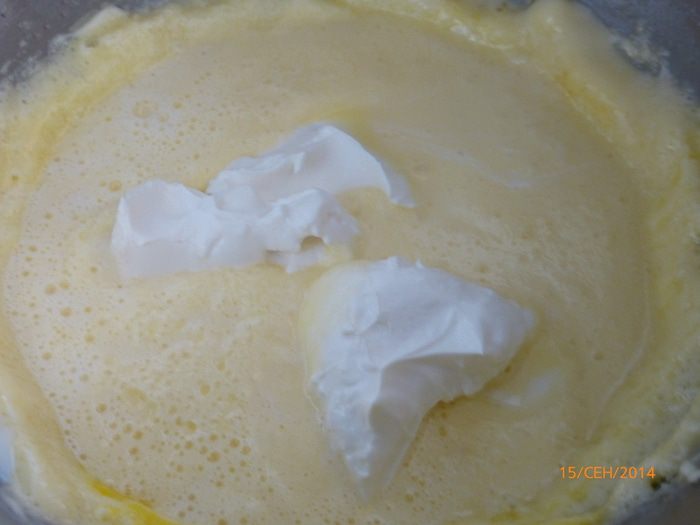 Продолжая взбивать, добавляем по одному яйца. Вливаем молоко и добавляем маскарпоне, еще раз хорошо взбиваем.