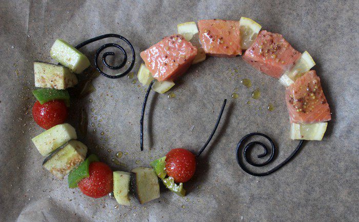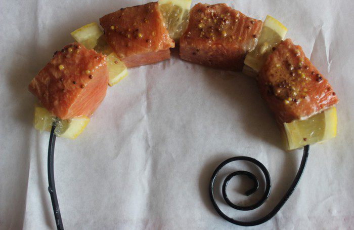 Нанизать на другой шампур куски рыбы, чередуя из с ломтиками лимона.