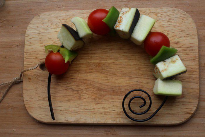 Для овощного шашлыка можно брать любые овощи помимо перечисленных - лук репчатый, лук-порей, морковь, картофель, тыкву, фенхель и т.д. Нарезать овощи примерно одинаково и нанизать на шампур, чередуя.