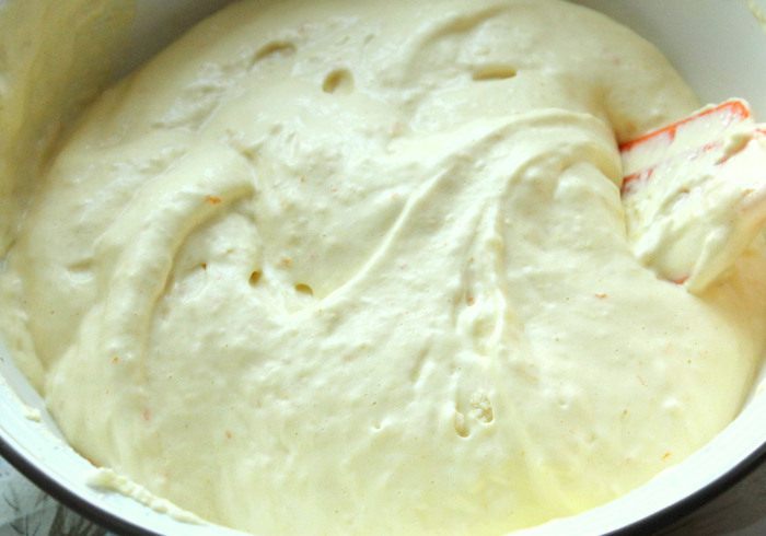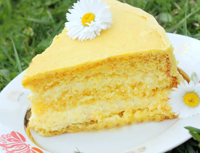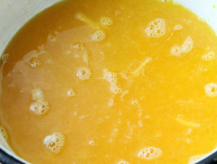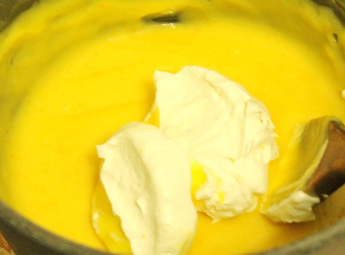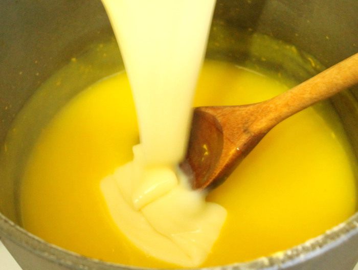 Для крема в толстостенной кастрюле смешать свежевыжатый апельсиновый сок, добавить крахмал, перемешать, поставить на средний огонь, постоянно помешивая. Как только масса загустеет, добавить сгущённое молоко и проварить на небольшом огне до тех пор, пока масса вновь не загустеет. На это уйдёт около 7-10 минут. Полученный крем снять с огня, перелить в другую миску, плотно прижать поверхность крема пищевой плёнкой, чтобы не образовалась корочка и дать ему полностью остыть.