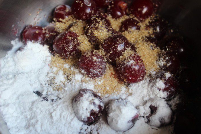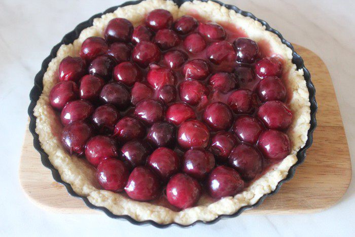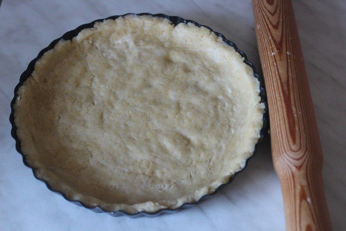 Для теста соединить два вида муки, разрыхлитель, сахар и соль. Смешать мучную смесь с холодным маслом до состояния крошки. Удобнее это сделать в комбайне или при помощи блендера. Добавить яйцо и сметану и замесить гладкое тесто. При необходимости добавить немного муки. Сформировать из теста шар, затянуть пищевой пленкой и охладить в течение 30 минут. Затем тесто раскатать, выложить в форму и отправить в холодильник еще на 30 минут.