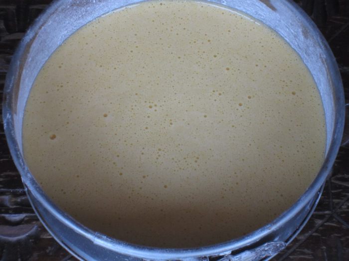 Форму диаметром 20 см смазать маслом и присыпать мукой.Выложить тесто в форму и выпекать в разогретой до 180 ° С духовке 25 минут до сухой палочки.