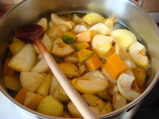 Как закипит варить 20 минут, блендером все пюрировать + сахар +сок пол лимона и варить еще 10 минут.