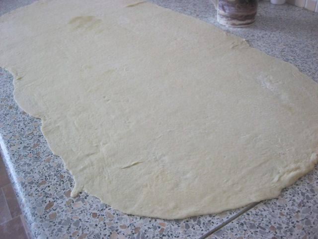 Поверхность присыпать мукой, раскатать тесто очень тонко, в виде прямоугольника, чтобы одна сторона была в два раза больше другой, я раскатала, примерно, 30 на 60 см.