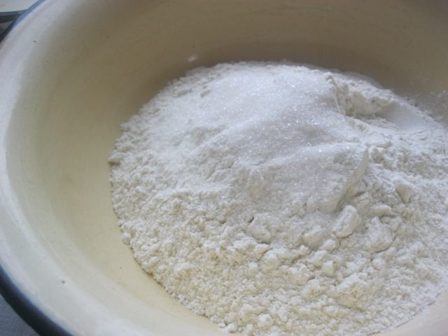 Смешать муку с сахаром и солью.
